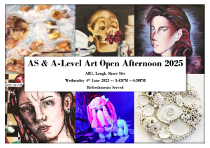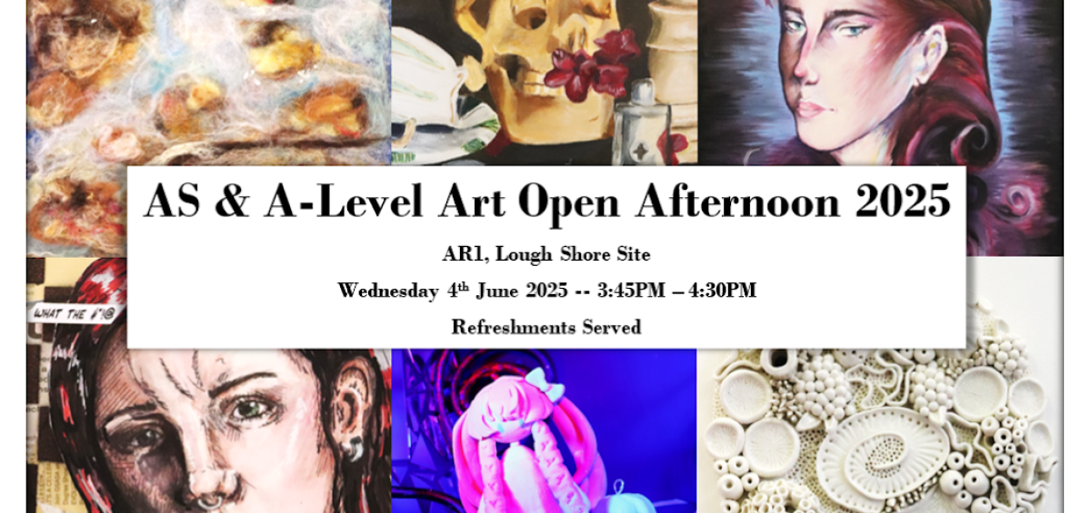 Please join us on Wednesday 4th June 2025 from 3.45 to 4.30pm in AR1 (Lough Shore Site) for a vibrant showcase of artistic talent. Our AS and A’ Level Art & Design students look forward to displaying their creativity, skill and passion in this diverse collection of work. Light refreshments will be served. Everyone welcome.