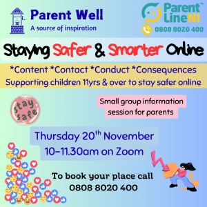 Please find attached the flyer for Parentline NI’s new workshop, Parent Well- Staying Safer & Smarter Online.