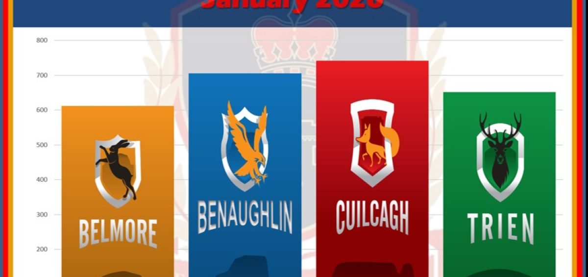 The totals for January 2026 have now been calculated. Cuilcagh move back into the lead with 742 points and Benaughlin in a strong second place with 705 points. Belmore and Trien and battle it out for 3rd and 4th position with only a 40 point difference. This month’s totals have been based on a number of competitions including Chess and Halloween Numeracy in November as well as SIMS house points for contribution to school community, and monthly bonus house points for any student who had 100% attendance in December and January.
