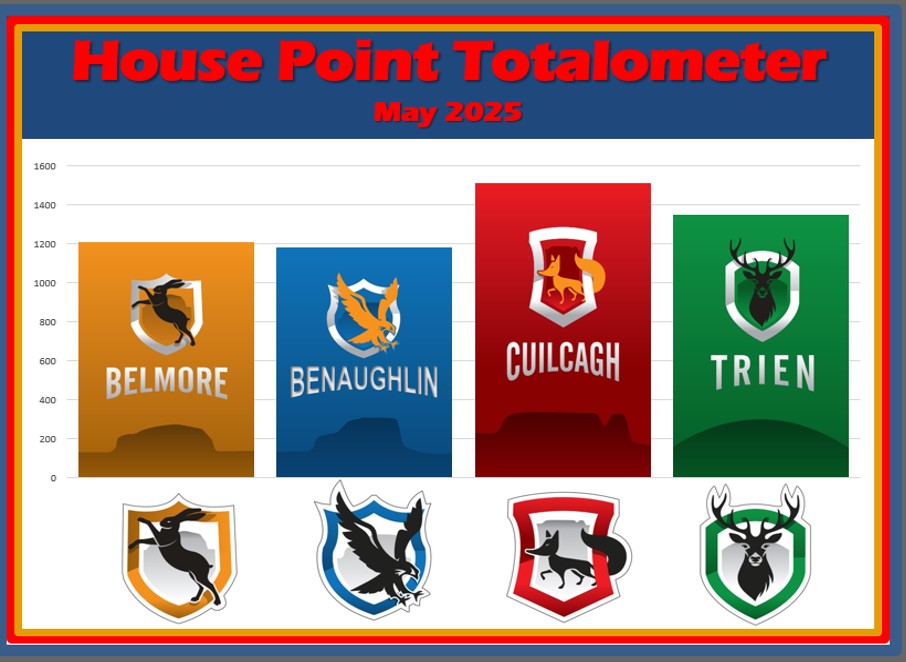 Cuilcagh maintain their lead this month with an impressive 1510 points, showing consistent excellence across all areas. Trien follows closely, with strong performances in both academic and extracurricular activities.